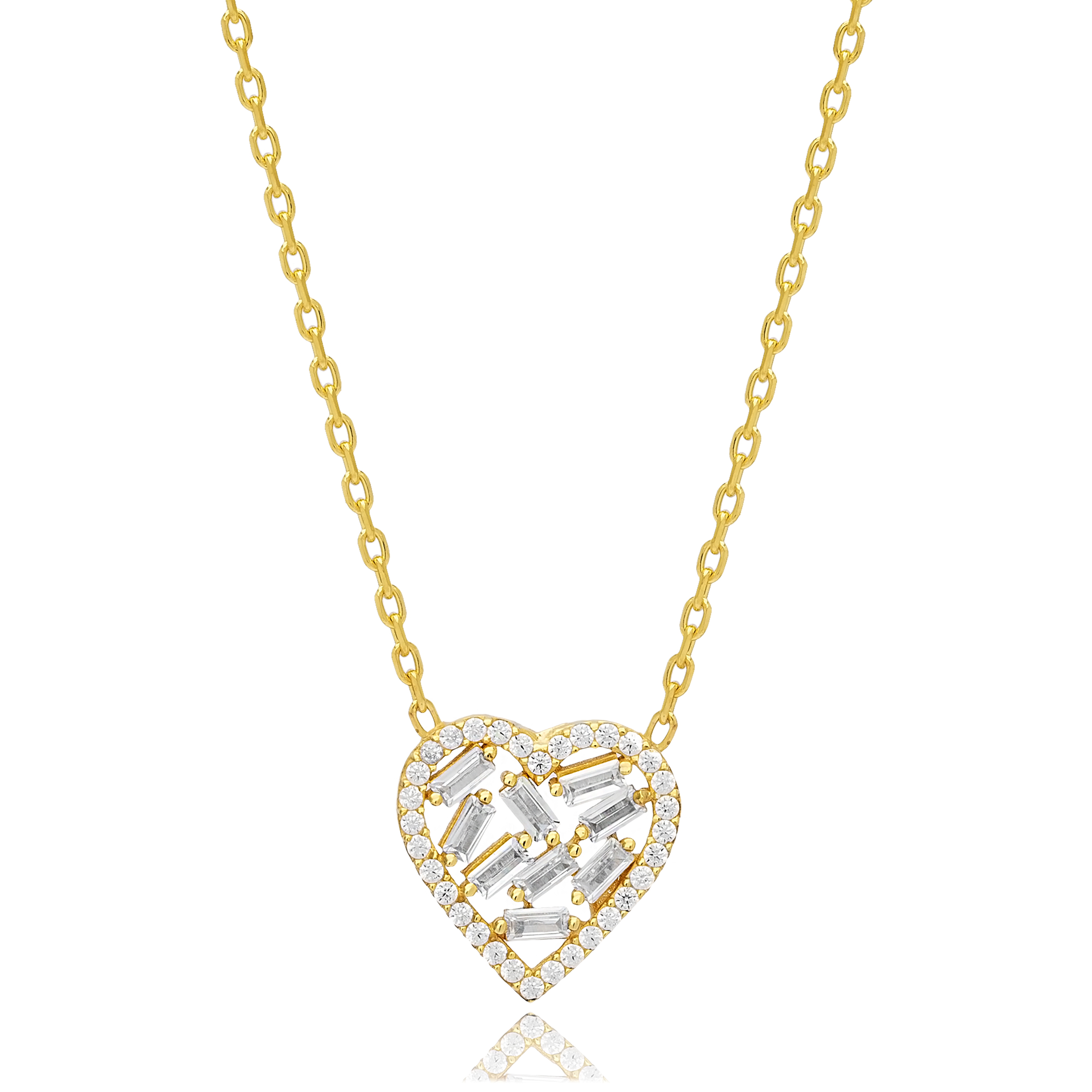 Baguette and round-cut zircon stones are set in a heart-shaped frame, creating a radiant mosaic that captures love’s elegance and complexity.